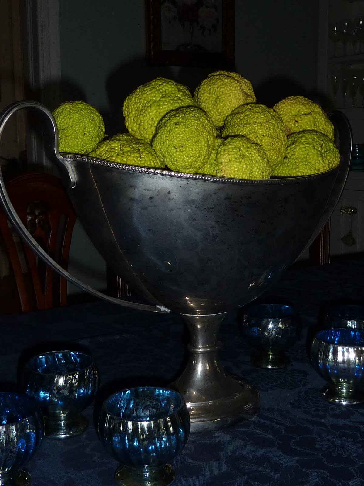 Oh! how we love the day the hearty Hedge Apple (or Osage Orange) tree begins dropping fruit en masse.