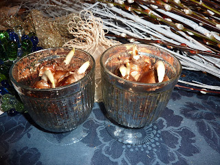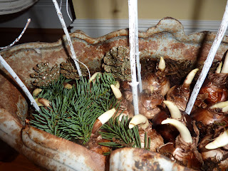 A few sprigs of greens were tucked in with the bulbs, along with some glittered pinecones to create a more natural feeling.