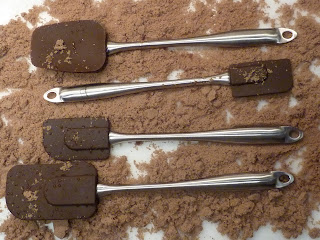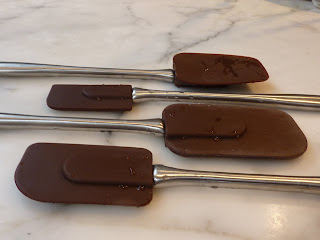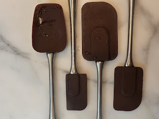 Once this set of spatulas arrived via Amazon, nothing else would do in the Splendid kitchen. I immediately developed an affinity to the sturdy, shapely stainless steel handles, hollow and so well weighted. They allow one to stir, scoop, smooth and scrape with alluring ease. The “bittersweet chocolate” color is easy on the eye, bright colored foods look nice against it, and brownish colored foods blend in.
