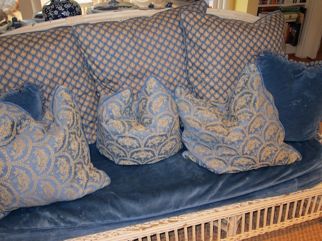 The blue velvet and the blue and yellow patterned cushions on the white willow couch below are the original winter covers. The blue and yellow Provencal back cushions got squeezed in sometime later in the game!!