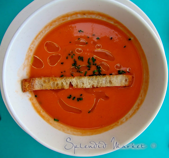The arrival of heirloom tomatoes in the market always inspires me to make Gazpacho. This spunky, refreshing soup seems to please most every palate. Now, after seeing how they serve it in Spain, I’m inspired to serve gazpacho with a fresh presentation…maybe I’ll offer a gazpacho “bar” with a variety of chunky options.