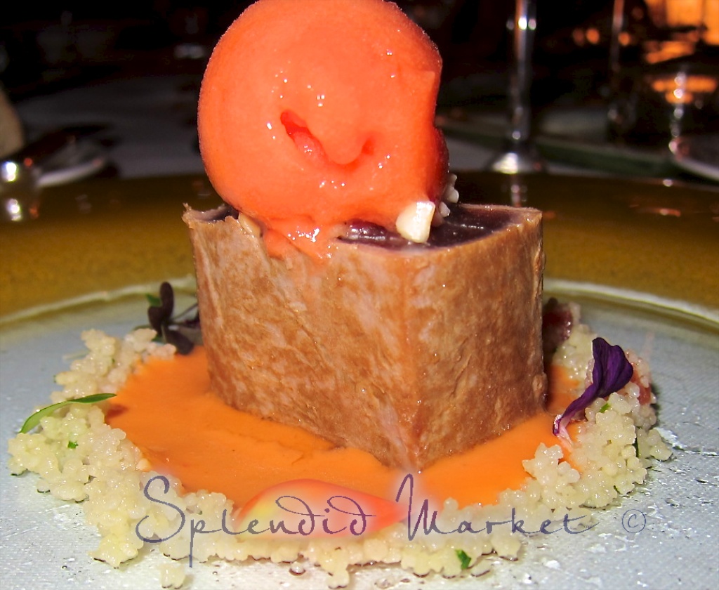 Here’s a whole different form for this popular soup. A frozen scoop topped my marinated tuna at the restaurant El Olivio on Mallorca. The flavor was delightful as it began to melt and spread over the tuna and bed of cous cous on the plate..