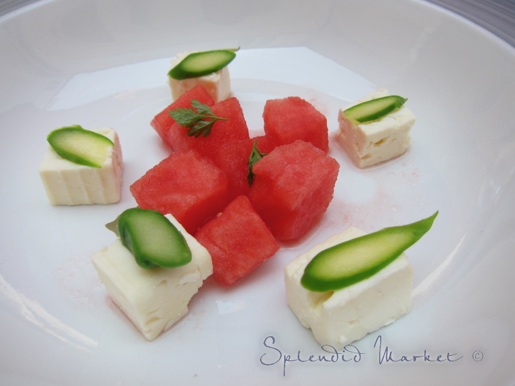 The soup plate was decorated with cubes of watermelon and feta cheese topped with thin slices of asparagus.