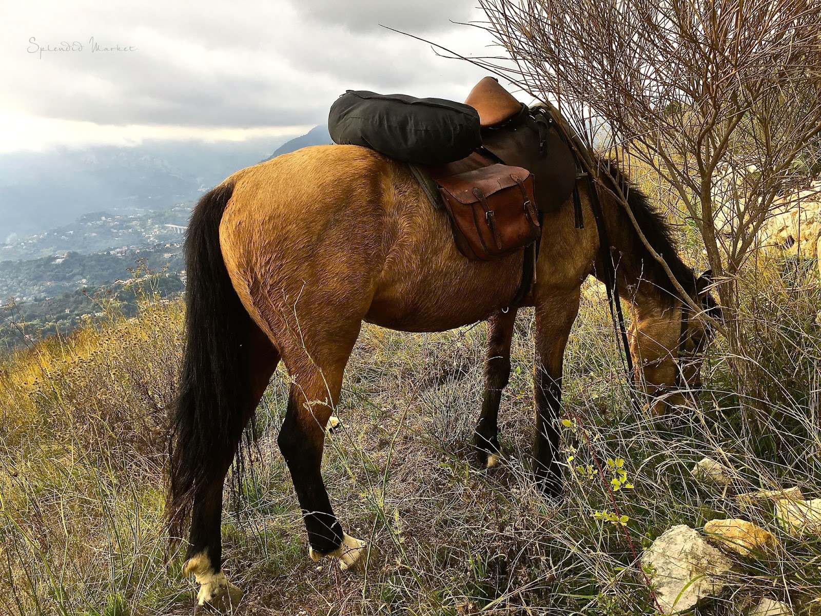 We secured the horse reins and allowed them to roam and enjoy lunch on the hillside. Here is my trusty friend, dear Uslaine, all geared up to go, with my “banana” {which will eventually disappear, one of the mystery segments} on the back of the saddle. This black nylon, weather proof bag was for my clothes and personal items as was the leather saddle bag hanging beneath it.