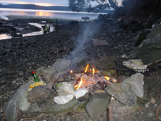 When the flames have died down a little and there is a good base of embers, build a frame or stand for the grill using beach wood or rocks and rest the grill on the frame.