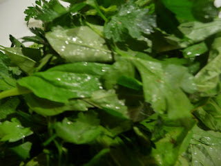 Here’s how we do it: wash and dry your herbs — plucking the leaves and processing them through a salad spinner works well, you can do all of one (basil is the most traditional) or mix any combination of basil, parsley, cilantro….make sure they are very dry before proceeding. Absent a salad spinner, rinse them in a colander and roll them in paper towels to dry.