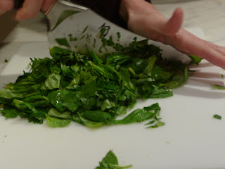 A hard chopping method is hard on the delicate cutting surface of a good knife, and makes the final product less consistent. As you continue the process you’ll see the oils releasing and the herbs turning a deeper green color (your hands will smell wonderful when you are finished).