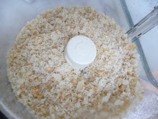 To prepare the bread crumbs: slice a day old ciabatta loaf lengthwise (so the slices can fit into the mouth of your food processor), using the steel blade attachment process the bread lengths until nicely “crumbed”.