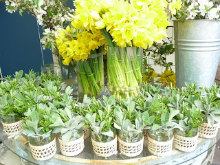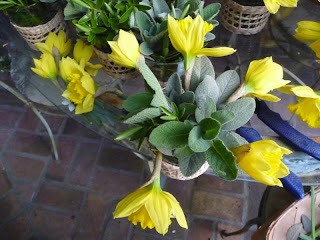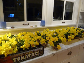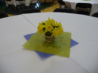 Daffodils from local fields were the least expensive flowers available, the blossoms are big and the yellow is a nice complement to the school colors. We bought 30 bunches of 10 daffodils.