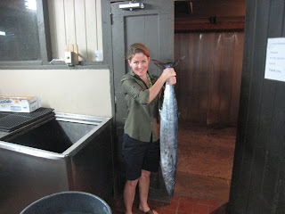 One night, while dining, your author witnessed a barrel of fish, so heavy it took 2 men to carry it, marching down the dock. After being excused from the table, she followed the barrel towards the kitchen to the “fish house”.
