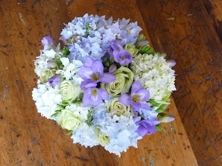 Choose complementary or contrasting flowers, we’re using a green rose and fragrant violet colored freesia, which complement the blue and white hydrangeas nicely.