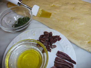 Brush dough with olive oil, sprinkle with the rest of the thyme leaves, coarsely chopped anchovies, a pinch of salt and fresh ground pepper.