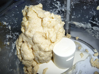Run food processor and slowly pour in warm water and tablespoon of olive oil.