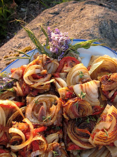 Using a spatula, place caramelized onions over tomatoes. Uniformly place anchovy halves on onions. Evenly distribute olives over top. (Warn guest of pits in Niçoise olives)