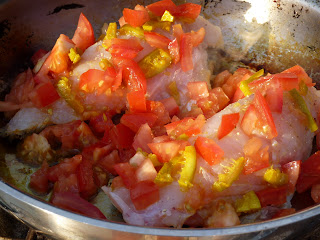 Sprinkle lime rind slices or zest on top of fish. Scatter chopped tomato on top of fish.