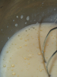 Add to the eggs the flour, milk, sour cream, salt and vanilla. Continue to beat until the batter is smooth.