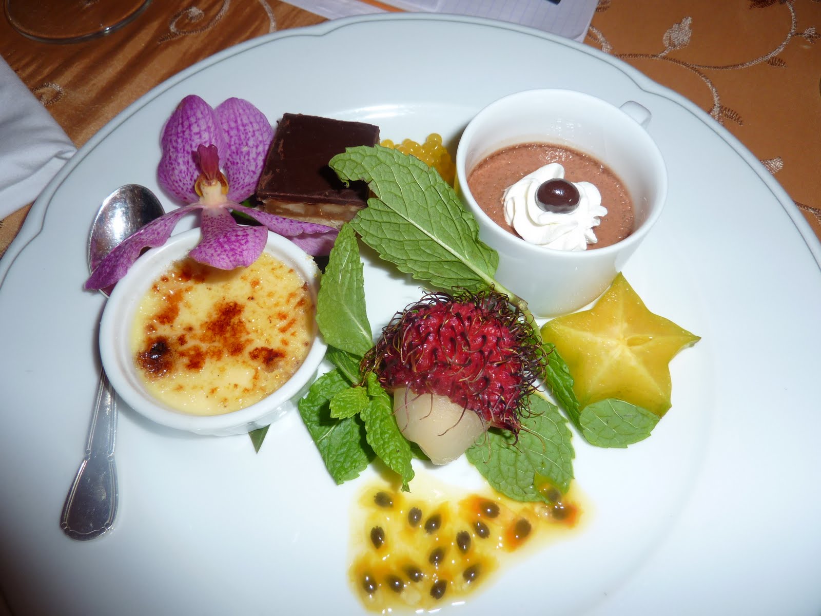 For dessert, the chef served a sampling of delights including a Chocolate Caramel Macadamia Nut Square, Ginger Crème Brulee and Kona Coffee Pot de Crème garnished with exotic tropical fruitss including starfruits, lilikoi caviar, and poha’a berries.