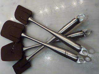 Once this set of spatulas arrived via Amazon, nothing else would do in the Splendid kitchen. I immediately developed an affinity to the sturdy, shapely stainless steel handles, hollow and so well weighted. They allow one to stir, scoop, smooth and scrape with alluring ease. The “bittersweet chocolate” color is easy on the eye, bright colored foods look nice against it, and brownish colored foods blend in.