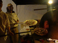 Here are some shots from a previous daytime event, so you can see this beautifully crafted kitchen-on-wheels. Made of handsome wood and topped with a clay dome, it is a vision, but what comes out of that oven is the true delight!