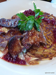The most delectable duck foie gras EVER! Served with a rosti (potatoes, cheese, bacon) and drizzled with a tangy cranberry or lingonberry sauce.