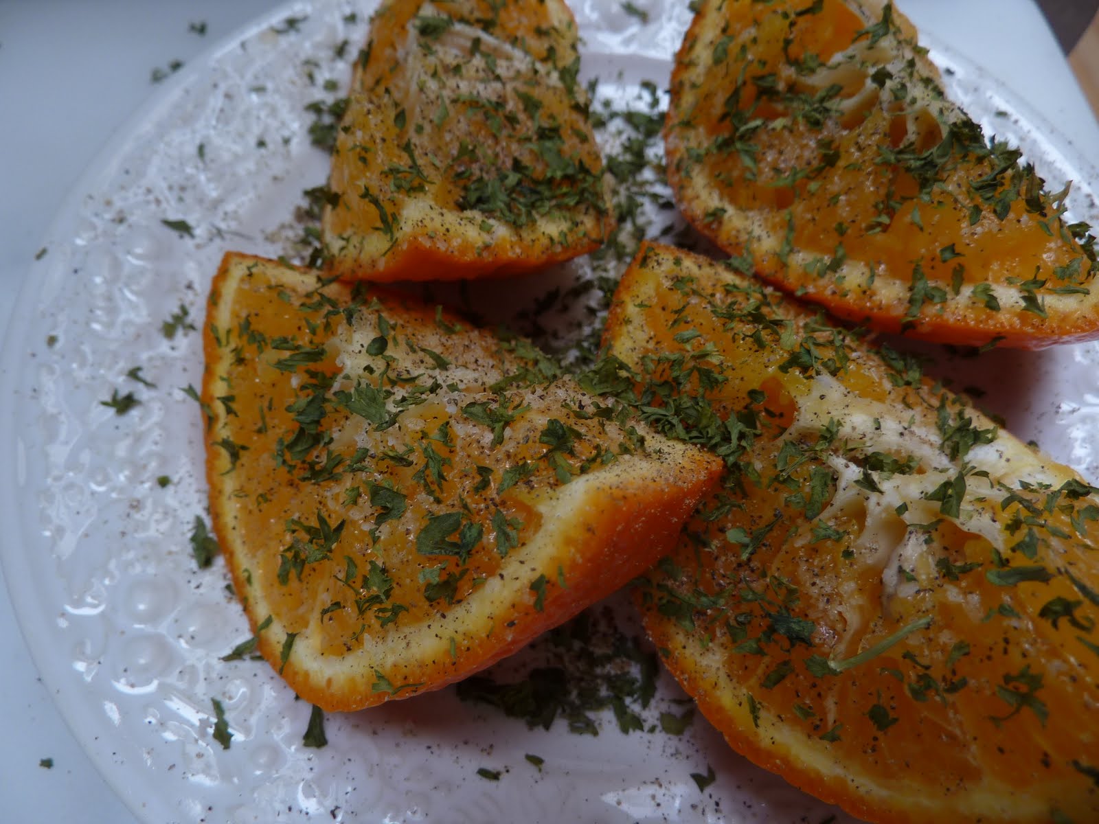Cut an orange into quarters, squeeze the juice into the cavity of the chicken. Sprinkle the orange quarters with salt, pepper and fresh or dried parsley to taste.