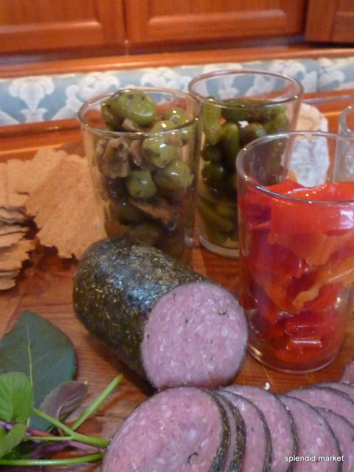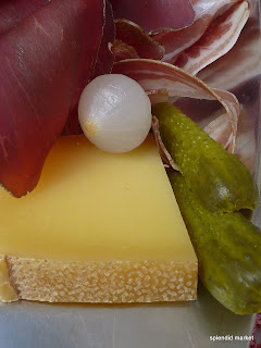 Cornichons, olives, pickled spicy peppers and boiled onions were tangy accents to the mellow meats and cheeses.