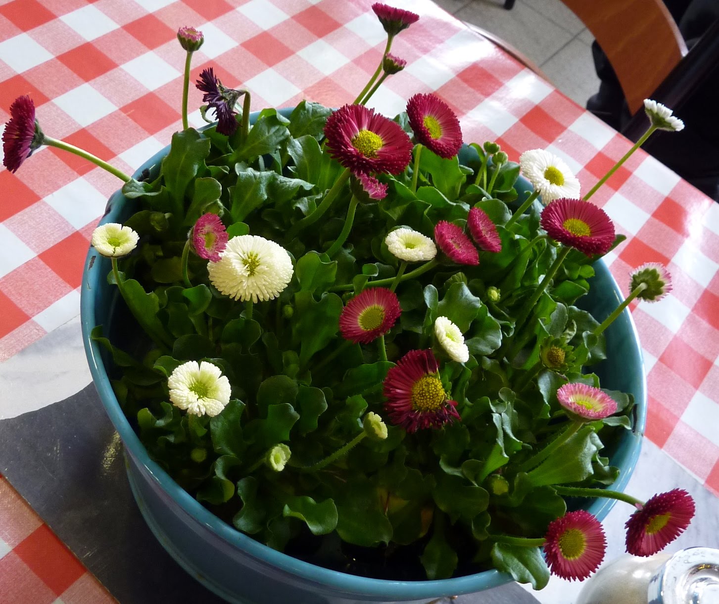 Note the small pot of flowers (pansies?) near the rosé above – a delightful bit of color. We love British Daisies, and found this colorful cache of them to be so cheerful on the table.
