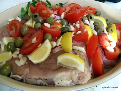 Place the chicken breasts, skin side down in a baking dish. Place the oregano sprigs in the dish. Strew the lemons, olives, tomatoes and garlic on top of the chicken, pour the wine over the mix.