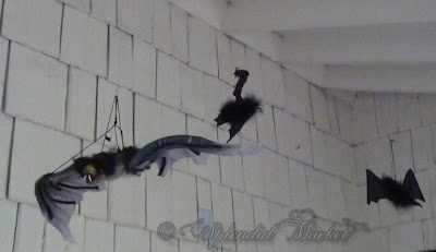 We hammered clear thumbtacks into the beams which cover the walkway at the market. The bats were hung from the tacks using thin silver paddle wire (filament or fishing line works well too).