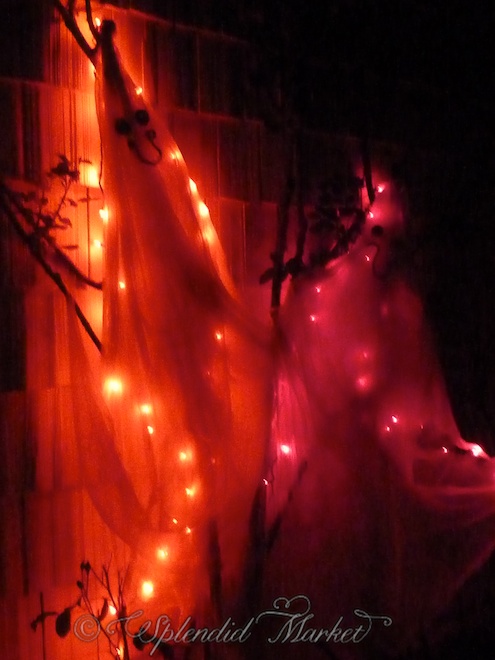 While I wanted a spooky stand out, I also wanted something that would blend in with the gardens. Looking around the market I was able to find some natural materials with which I could easily create structure for my splendid spirits. Look around — maybe you have some things in your surroundings, which could easily be converted, with simple shrouds of cheesecloth, into a lovely, billowing decoration for all hallow’s eve.