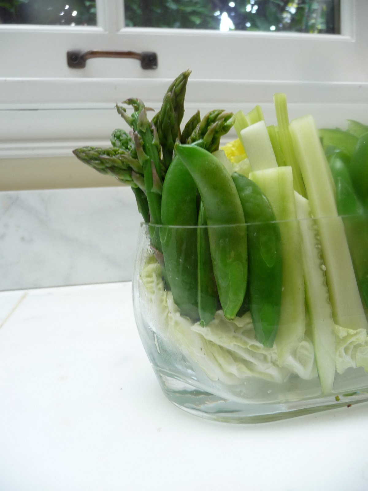 This oval shape vase is lined with Napa cabbage leaves. Gather the prepared vegetables in small bunches and tightly pack the bunches into into the vase.