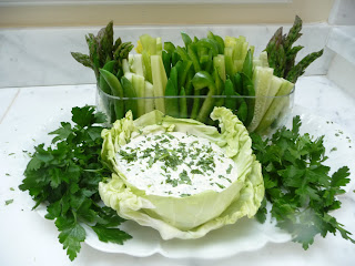 The oval vase of vegetables was placed length wise on a large white platter. Two cabbage leaves were nested together to create a secure bowl, and then filled with the dip.