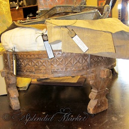 | This was a grain grinder from British Colonial India, now reformed into a handsome cushion topped ottoman. |