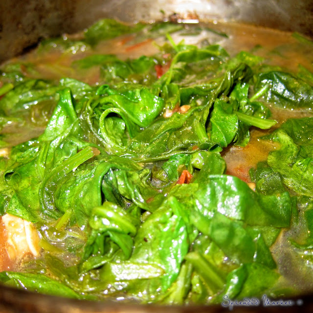 And, into the broth in which I poached the chicken breast, I piled about 1/4 pound of baby spinach leaves. I turned up the heat and allowed the leaves to wilt.