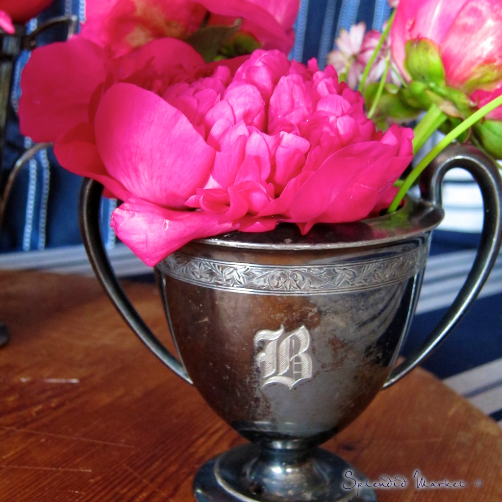 Years ago, I was thrilled to find this silver plated tea set at an estate sale, bearing my family initial. I’ve been arranging flowers in the various vessels ever since.