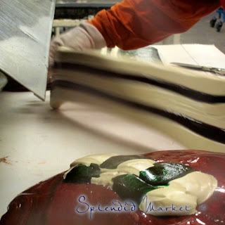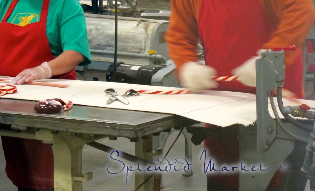He trims the ends off of the formed candy and adds it to the multi-colored pile front and center. This leftover part of the candy becomes part of the filling for the candy canes.