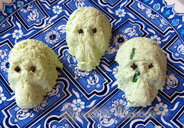 I made the greenish skulls near the top of the post for a cocktail party last weekend. After lining the day~of~the~dead skull molds with olive oil and plastic wrap I filled them with the boursin cheese. I refrigerated them overnight, then inverted the ghoulish green skulls from their molds and poked some whole cloves in to emphasize their eye sockets. I love the little strips of chives on the one skull, sort of looks like band~aids, don’t you think?