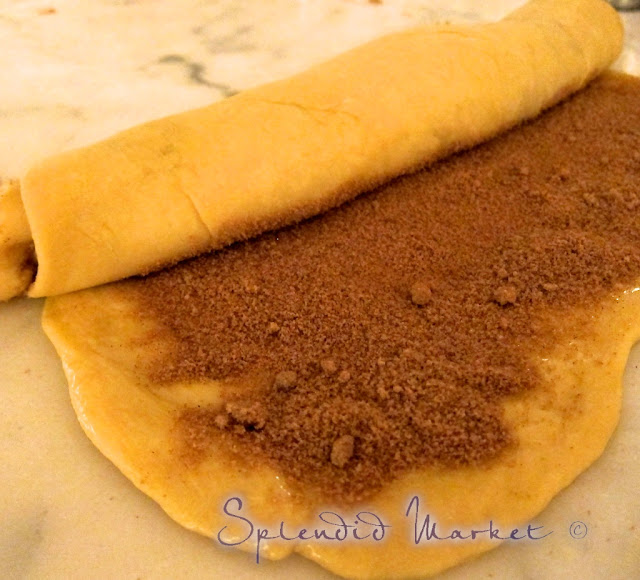 The afternoon before serving, I mix up this yummy~yeasty dough, and let it rise {I start feeling like the mother~of~the year at this point}. After a fabulous dinner out, I revisit the dough {with a nightcap}, flattening it out and covering it with a layer of cinnamon~sugar goodness.
