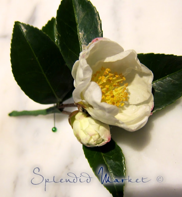 Is there any flower more appropriate for a winter fête than the lovely Camilla? I always keep some florist tape on hand and a few fancy straight pins, just in case.