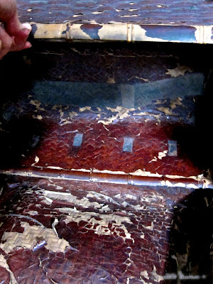 The story continues on the inside, a rich umber paint cracked and chipping away from the woven case.