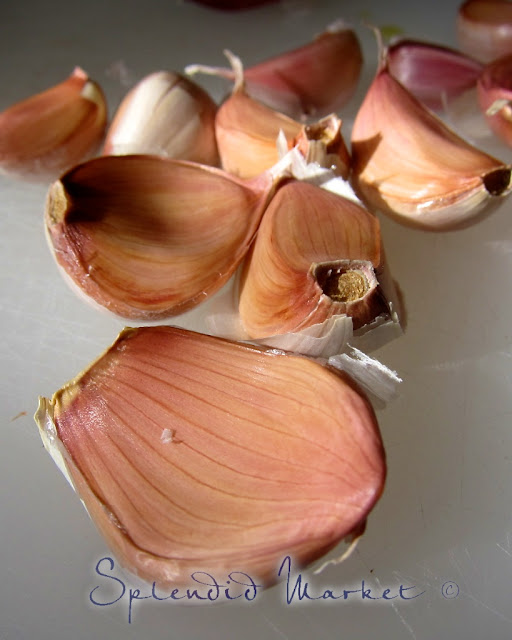 Then into a baking tray went, along with peeled garlic cloves from 2 heads of garlic.
