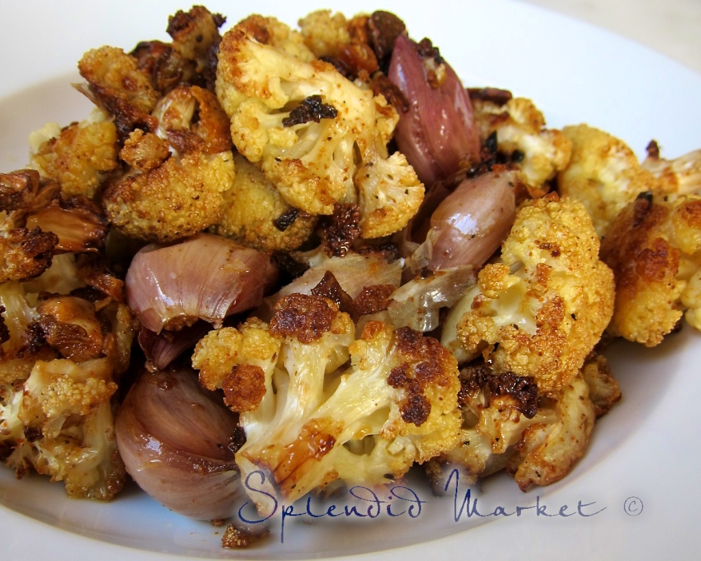 After trimming all of the florets from a head of Cauliflower and washing them I preheated the oven to 350 degrees, then tossed them in a mix of: