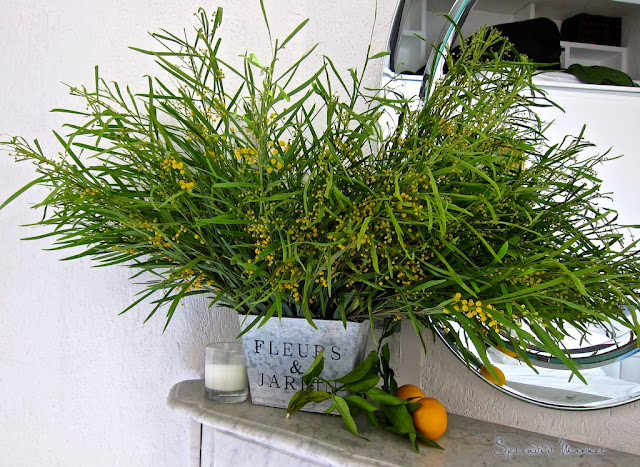 After the lunch {and this was a Sunday lunch in France, so it was ater dark at this point}, a friend stayed to chat. The flowers above were clear across the room but still, during our discussion, she suddenly went silent, paused, and then amorously commented on detecting the scent of mimosa!