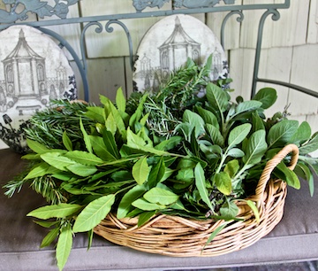 In addition to a flattering container, nothing compliments flowers better than an array of greenery. I grow lots of greens so that I always have plenty around for arrangements. Keeping in the English Garden theme I clipped a selection of herbs for these bouquets, spiky rosemary, shiny, deep green bay laurel and soft sage leaves.