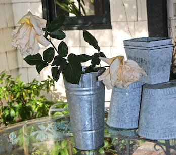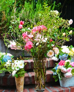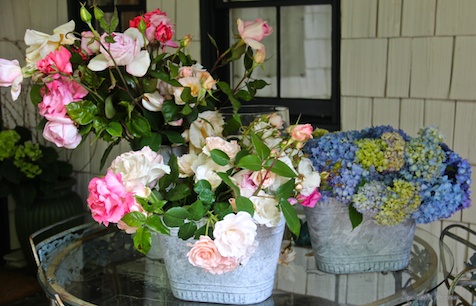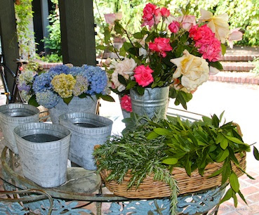 Next, I fill any openings with with my accent flowers, in this case, the roses. Finally, I add more sprigs of greenery to create a finished, full, lush look. I wish I had taken photos at the party, but my camera got misplaced. These three arrangements down the center of their weathered wood outdoor table. From the table we could see the rose garden from which the flowers were clipped.