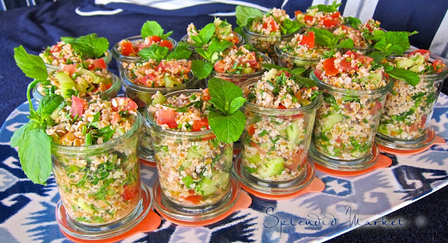 I got to help out with the garnish and presentation of the food, so I put another set of my fave Weck canning jars into play, creating individual portions of the Garden Tabbouleh, which was deliciously spiked with cucumbers, peppers, tomatoes and plenty of fresh mint and parsley.