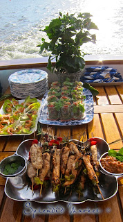 Everything was healthy, flavorful and alluring. The small mozzarella balls and cherry tomatoes for the Caprese Amuse~bouche were stacked on toothpicks between basil leaves; the Chicken Gloriouso entrée was skewered, and served with spunky dipping sauces. The Mushroom Aperitivos and Crab et Fromage Tartelettes were marvelous, warm, bite~sized morsels that were baked in muffin tins.