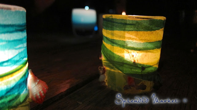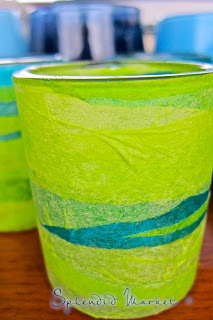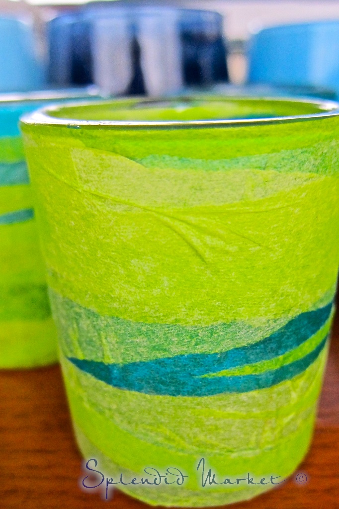 then dipped them into a mix of craft glue and water. I started wrapping the wet strips around on the exposed glass of the votives, weaving them in between the pieces of glass and shells that were attached and patiently held into position by tiny fingers so many years ago.