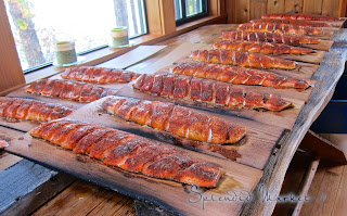 When I got there, the party preparations were well underway. I wish I could somehow share with you the incredible fragrance of these steamy~hot cedar planks, just off the grill, loaded with plump fillets of salmon.