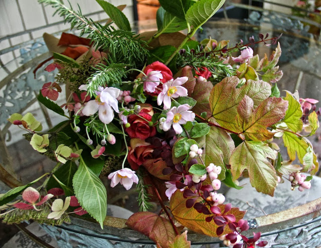 To find foliage that would complement them, I didn’t have to go much further than my own garden. Using the 1-2-3 theory from my previous post, the I rosemary spears, viburnum leaves, and the deep red leaves are step 1, the base shape for the arrangement. The Japanese Anemones, hydrangeas and roses are step 2, the flowers. Finally, for added texture and interest I added the snowberry branches for step 3.